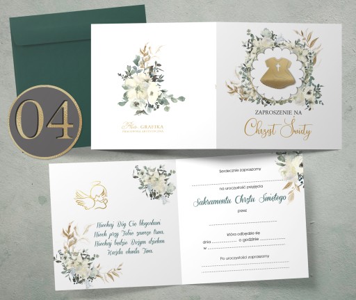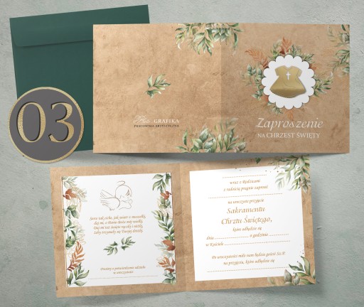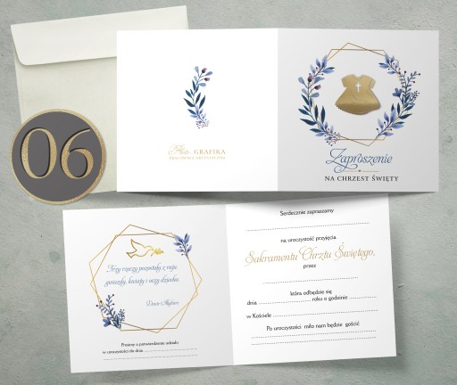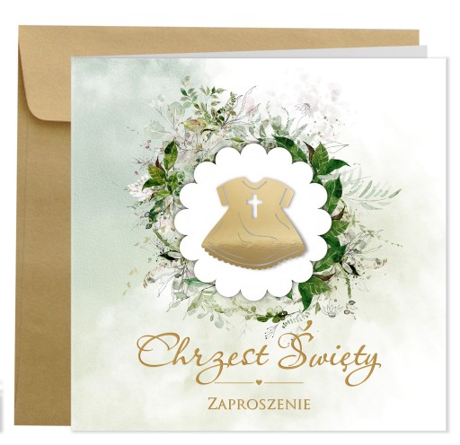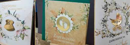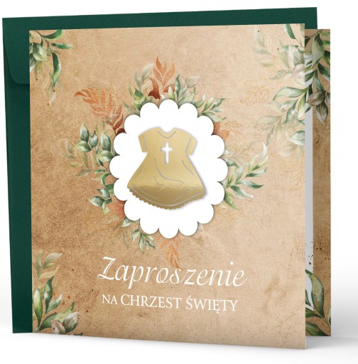 - Zaproszenie ozdobione jest wycinanym laserowo elementem 3D szatka ze złotego papieru lustrzanego