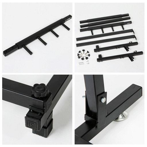 Lekka i składana konstrukcja pozwala na szybki montaż. Poprzeczna budowa przekłada się na stabilność i wytrzymałość stojaka. Ramy posiadaj miękkie, gąbkowe obicia, chroniące korpusy i gryfy instrumentów.