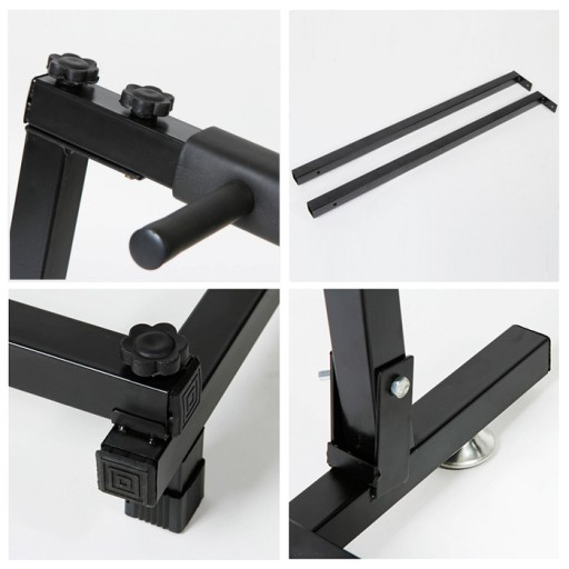 Lekka i składana konstrukcja pozwala na szybki montaż. Poprzeczna budowa przekłada się na stabilność i wytrzymałość stojaka. Ramy posiadaj miękkie, gąbkowe obicia, chroniące korpusy i gryfy instrumentów.