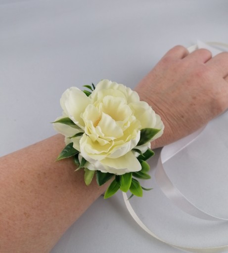 - upięty na satynowych tasiemkach /12 i 6 mm, białej i kremowej/