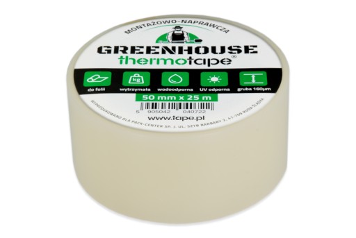 THERMOTAPE GREENHOUSE jest półelastyczną taśmą uszczelniającą i łączącą, nie przepuszczalną dla pary wodnej i gazów. Zastosowanie bezrozpuszczalnikowego kleju sprawia że warstwa klejąca taśmy nie wysycha i dobrze znosi rozszerzanie oraz kurczenie na skutek zmian temperaturowych.