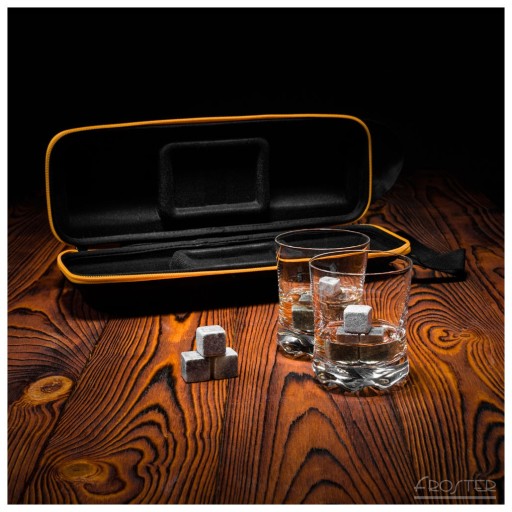 - zestaw zawiera eleganckie czarne etui, dwie szklanki do whisky oraz 9 kamiennych kostek do drinków w woreczku