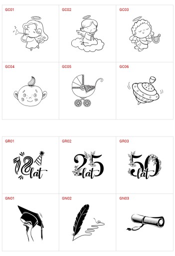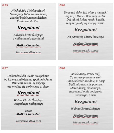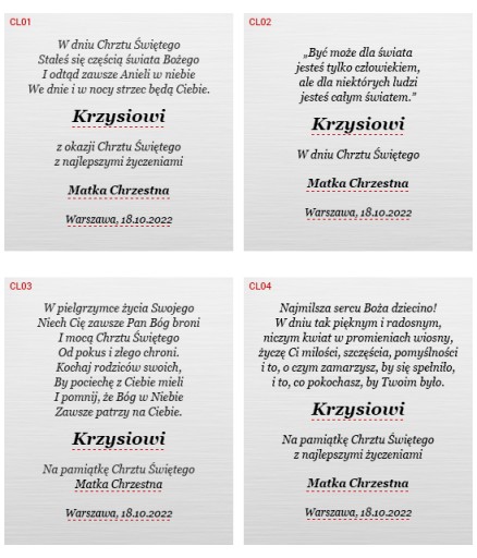 Możesz wybrać jeden z poniższych wzorów, podając jedynie wybrany numer oraz dane (podkreślone czerwoną linią), które należy zmienić lub możesz podesłać całkowicie własny tekst. Możesz również wybrać wzór obrazka, który może być umieszczony obok treści dedykacji. Jeżeli, chciałbyś umieścić na tabliczce własną grafikę najpierw wyślij ją nam do weryfikacji, czy da się ją umieścić.