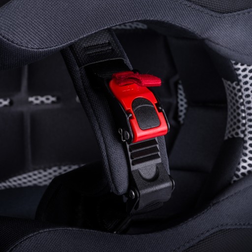 Kask wyposażony jest w bezpieczne i łatwe w obsłudze zapięcie mikrometryczne pozwalające na idealne dopasowanie do kształtu twarzy.
