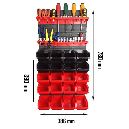 Tablica narzędziowa ORDERLINE do zawieszenia na ścianie, uniwersalna i przydatna w każdym garażu czy warsztacie. W komplecie 2 tablice montażowe, 20 pojemników, oraz 2 półki na narzędzia. Łatwy montaż pojemników na tablicy pozwala na ich dowolne przemieszczanie w zależności od potrzeb. W każdej chwili można też pojemnik zdjąć, by uzyskać dostęp do zawartości.