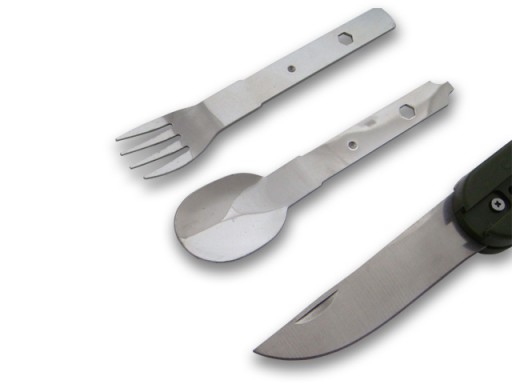 Zestaw zawiera: nóż, widelec, łyżkę, otwieracz do puszek, korkociąg, otwieracz do butelek.