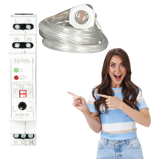 Wyłącznik zmierzchowy WZM-02/S1 służy do sterowania urządzeniami oświetleniowymi lub innymi odbiornikami energii w zależności od natężenia oświetlenia - załącza oświetlenie o zmierzchu i wyłącza o świcie. Urządzenie posiada dwa zakresy natężenia oświetlenia, w których użytkownik ma możliwość płynnej regulacji progu załączenia. Urządzenie posiada funkcję ciągłego załączenia odbiornika (ON) podłączonego do zacisków wyjściowych oraz funkcję pracy automatycznej (AUTO). Zewnętrzna sonda natężenia oświetlenia SOH-01 umożliwia umieszczenie jej w dogodnych miejscach.