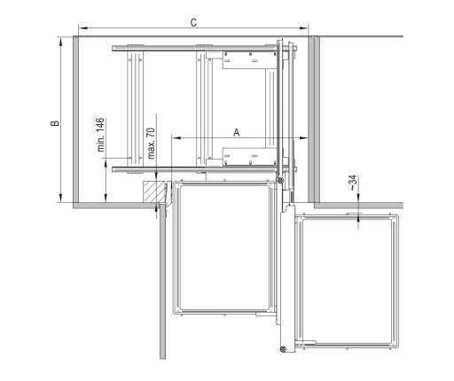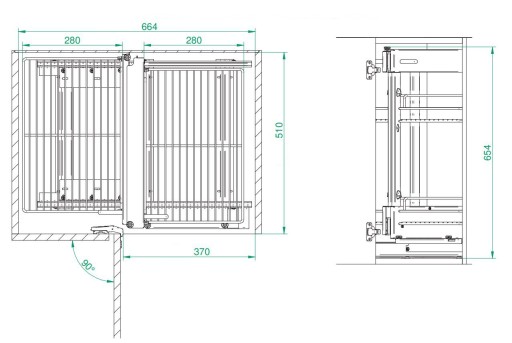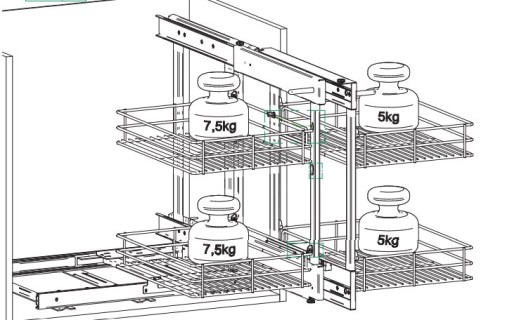 - Stelaż umożliwiający całkowity wysuw wszystkich koszy cornera z szafki, co ułatwia dostęp do produktów