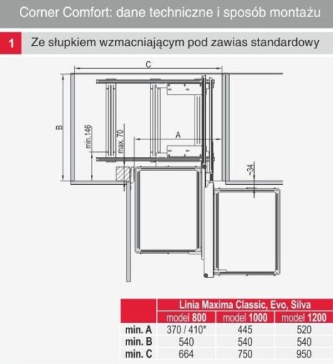 - Montaż do szafki narożnej z frontem na zawiasach standardowych lub równoległych