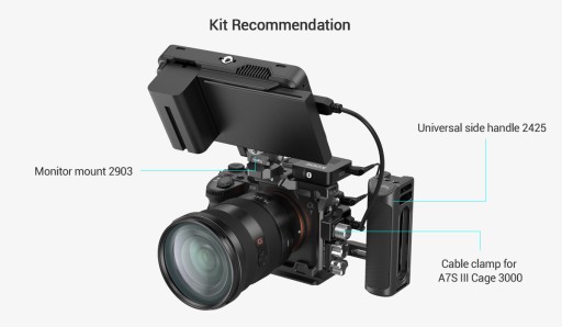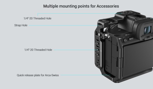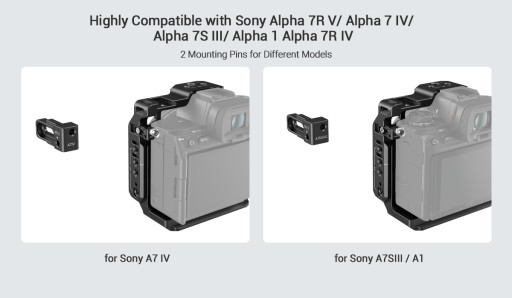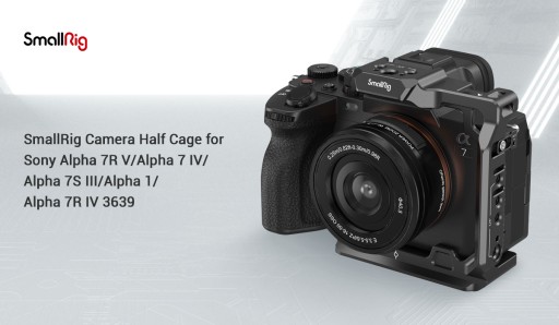 SmallRig Half Cage for Sony Alpha 7R V/Alpha 7 IV/Alpha 7S III/Alpha 1/Alpha 7R IV 3639 is designed to provide accessory mounts and protect the camera. It includes two locking side plates and one 1/4"-20 screw at the bottom to lock the camera and prevent deflection and gives access to dials and buttons while retaining the grip experience of a bare camera. Built-in all-around protective spacers protect the camera from being scratched. 1/4"-20 threaded holes, ARRI 3/8"-16 locating holes, and cold shoes support top handle 2165, side handle 2093, monitor mount 2903, microphones, LED lights, etc. Arca quick release plate at the bottom is compatible with DJI RS 2 / RSC 2 / RS 3 / RS 3 Pro and the quick release plate of DJI RS 2/RSC 2 stabilizers for stabilizer shooting. Optional HDMI Cable Clamp 3000 works with Alpha 7 IV/Alpha 7S III to protect interfaces and ensure stable signal transmission during filming. Besides, the cage comes with a built-in magnetic spanner that facilitates disassembly and assembly.