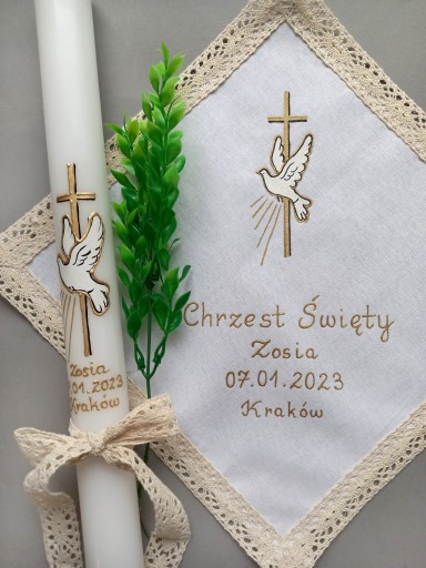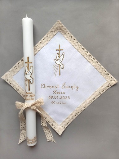 W skład zestawu do chrztu wchodzi świeca i szatka do chrztu z