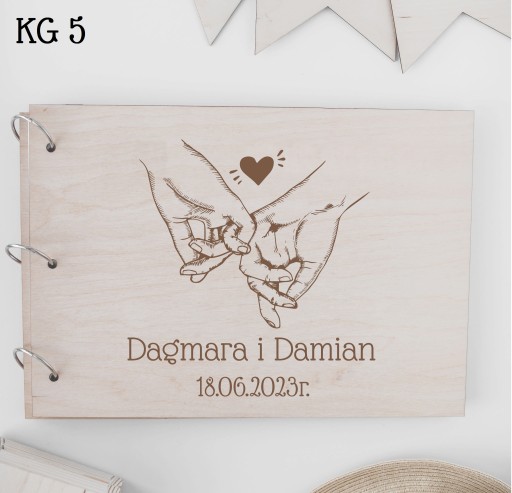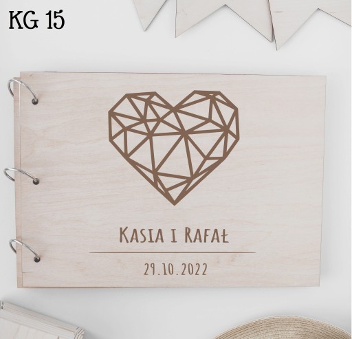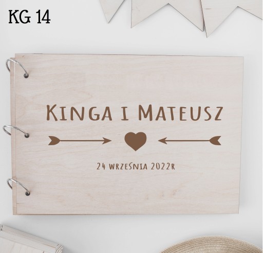 Drewniana księga gości stworzona została z 3mm sklejki brzozowej, 3 metalowych ringów oraz 30 białych kartek (60 stron) o gramaturze 250 g/m2.