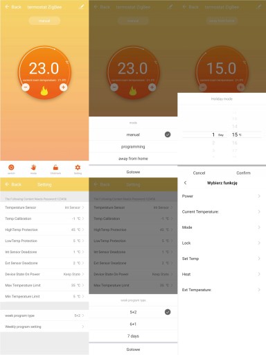 - Dzięki ustawieniom w aplikacji możemy min ustawić blokadę rodzicielską, korektę temperatury, maksymalna i minimalną wyświetlaną temperaturę lub ustawienie histerezy