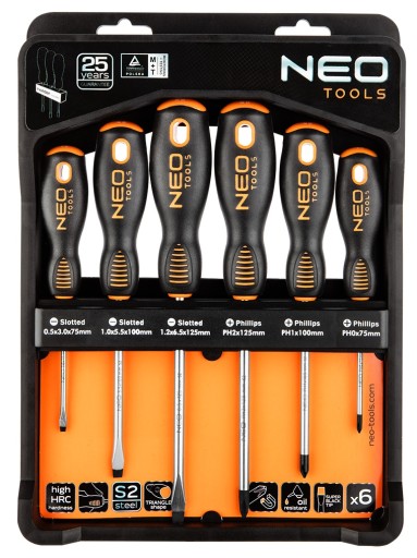 Zestaw narzędzi marki Neo Tools składa się z 6 sztuk wkrętaków płaskich i krzyżowych, których groty wykonane zostały z wyjątkowo wytrzymałej stali S2.