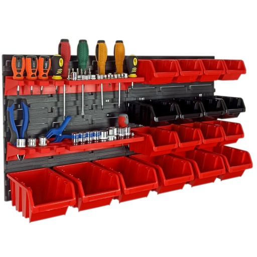 Tablica narzędziowa ORDERLINE do zawieszenia na ścianie, uniwersalna i przydatna w każdym garażu czy warsztacie. W komplecie 2 tablice montażowe, 18 pojemników, oraz 2 półki na narzędzia. Łatwy montaż pojemników na tablicy pozwala na ich dowolne przemieszczanie w zależności od potrzeb. W każdej chwili można też pojemnik zdjąć, by uzyskać dostęp do zawartości.