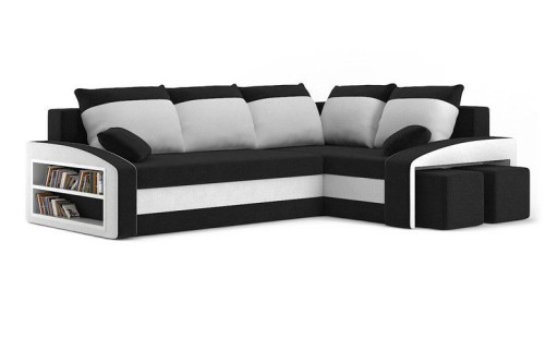 Duży narożnik, półka, pufy, prawy, Grande, 255x180x75 cm, biel, czarny. Zadbaj o kącik wypoczynkowy z komfortowym narożnikiem Grande! Nowoczesny narożnik z wypełnieniem piankowym świetnie sprawdzi się w dużym salonie lub pokoju dziennym, oszałamiając swoją estetyką. Klasyczna forma narożnika połączona z funkcjonalnymi rozwiązaniami technologicznymi w postaci podłokietników, luźnych poduszek i dużych pojemników na pościel będzie idealną ozdobą i jednocześnie miejscem spotkań z rodziną i przyjaciółmi.