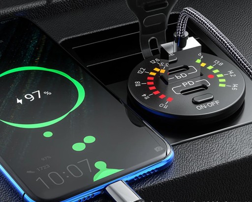 Wysokiej jakości ładowarka samochodowa z woltomierzem. Wyposażona w dwa porty USB i USB-C