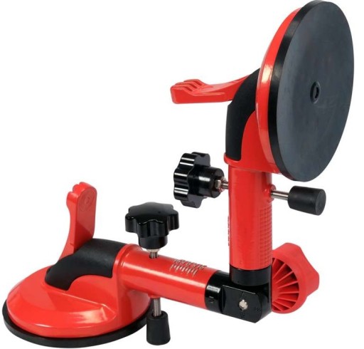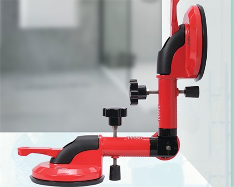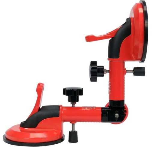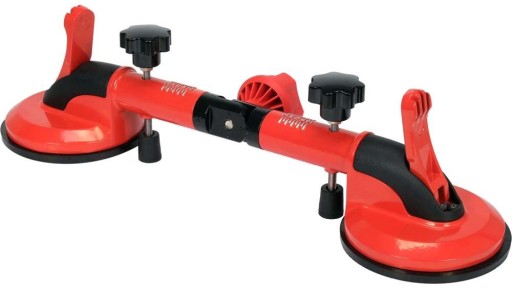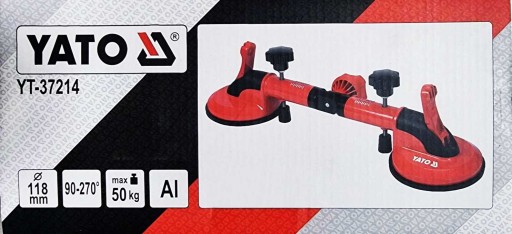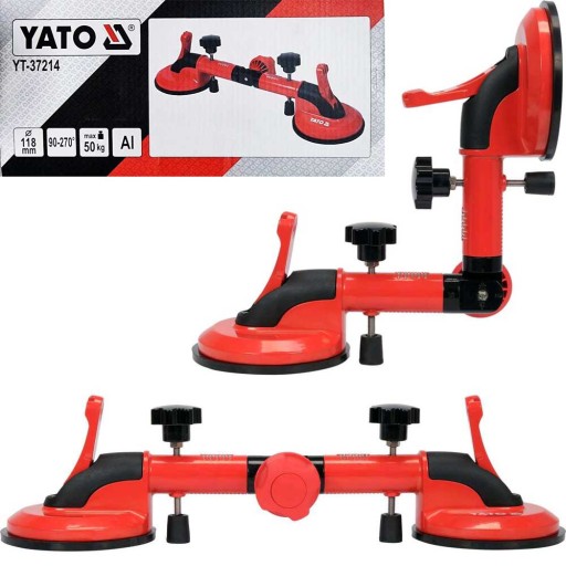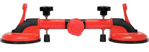 Podwójna przyssawka marki YATO, przeznaczona do przenoszenia elementów o płaskich, gładkich powierzchniach np. szyb okiennych, samochodowych, arkuszy blach, płytek ceramicznych, płyt laminowanych.