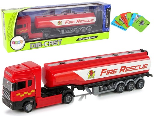 Ciężarówka ze względu na swoją prostą funkcjonalność, z pewnością zainteresuje i zachęci do samodzielnej zabawy, a dzięki niewielkiemu gabarytowi pojazdu, dziecko może takie autko zabrać ze sobą do przedszkola, do lekarza lub na wycieczkę rodzinną. Wygląda jak prawdziwy odpowiednik, który jeździ po drogach i każdy mały kolekcjoner może poszerzyć swoją kolekcję. Całość ma kolor czerwony z białymi napisami FIRE RESCUE. Cysterną można skręcać na boki, dlatego ma możliwość dużego manewrowania.