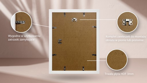 Wykonana z laminowanej płyty MDF - lekka a jednocześnie wytrzymała. Zawiera komplet zawieszek oraz pozwala na zamontowanie obrazu w dwóch płaszczyznach.