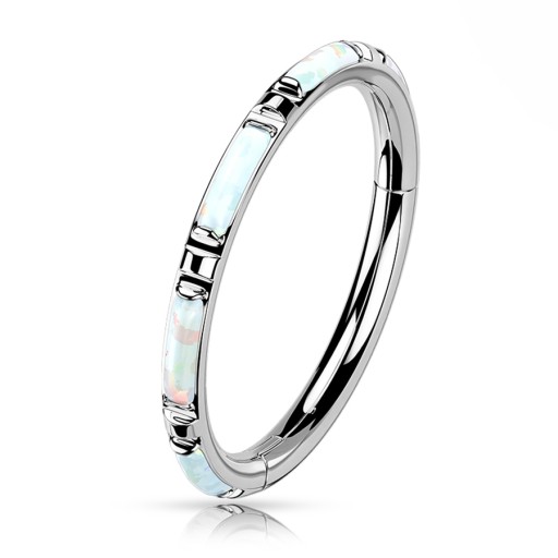 Clicker z podłużnymi, białymi, syntetycznymi opalami na froncie.
