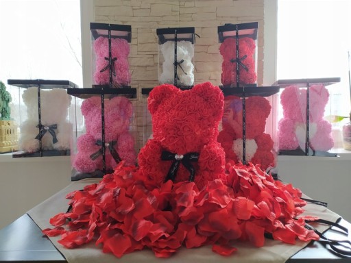 Szukasz sposobu aby zachwycić drugą połówkę? Miś wykonany z kilkuset różyczek to wspaniały prezent urodzinowy, imieninowy, czy ślubny. Możesz go również wręczyć z okazji Walentynek, Dnia Matki, a także wtedy, gdy chcesz w unikalny sposób uczcić Dzień Kobiet.