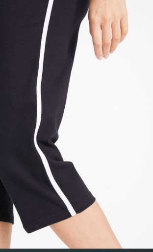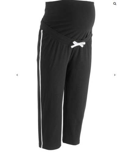 Oryginalne spodnie ciążowe z kolekcji BonPrix, fason i kolorystyka jak na zdjęciach pod opisem- CZARNY z białym lampasem wzdłuz nogawek. Fason swobodny, dresowy, z elastycznym pasem na brzuch , z trokami na gumie. Nogawki o długości ok. 3/4.