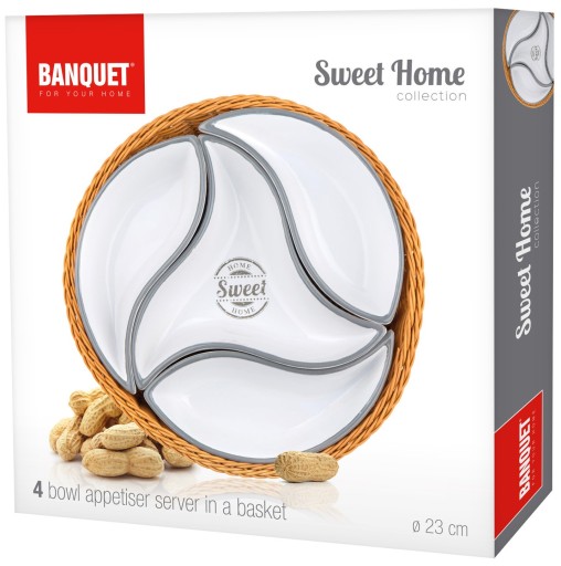 Zestaw ceramicznych miseczek w plecionym koszyku PCV z linii Sweet Home marki Banquet, w którym można serwować przekąski (chipsy, bataty, orzeszki, owoce itp.) oraz sosy. Komplet naczyń doskonale prezentuje się na stole. Idealny na każdą uroczystość zarówno w domu, jak i w gastronomi.