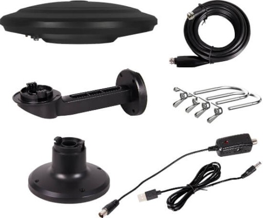 Praktyczny uchwyt umożliwia przymocowanie anteny do rurki, masztu, barierki balkonowej itp. (szczególnie przydatny m.in. w kamperach, na jachtach). Komplet elementów mocujących w zestawie.
