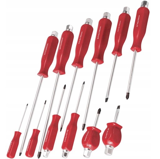 12 elementowy zestaw wkrętaków do pobijania. Niezbędne jako wyposażenie przydomowego warsztatu, profesjonalnych serwisów naprawy samochodów czy garażu. Wkrętaki zakończone wzmocnioną metalową skuwką do pobijania. Cechują się dużą wytrzymałością, co wpływa na ich odporność oraz długoletnie użytkowanie. Rękojeści zostały zakończone nasadami na klucz sześciokątny. Dzięki temu przy użyciu klucza bądź grzechotki możemy zwiększyć siłę odkręcania. Całość zapakowana na blistrze.