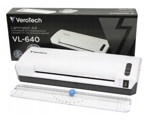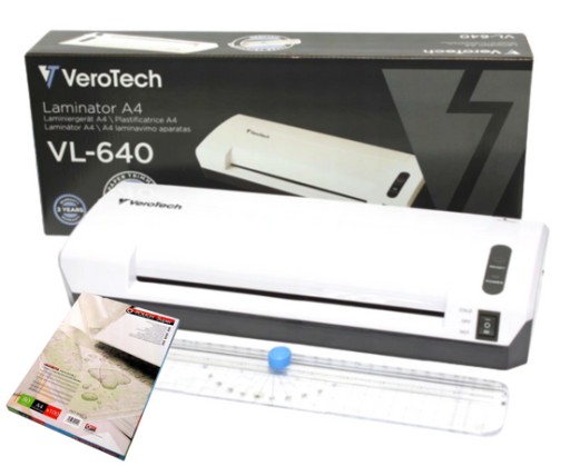 Zestaw marki Verotech – 3w1 obejmuje laminator, trymer do papieru oraz zestaw folii. Laminator pozwala na bardzo szybkie laminowanie zarówno na gorąco, jak i na zimno dokumentów w formacie A4 oraz mniejszym.