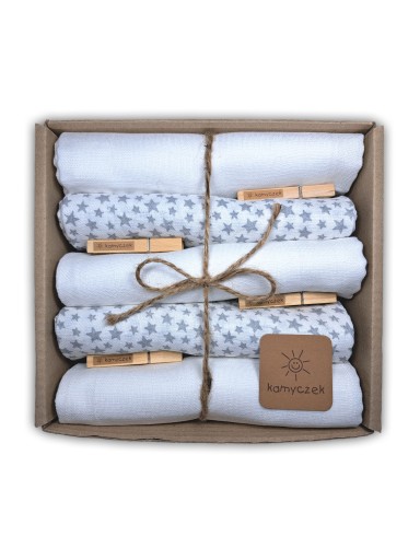 Komplet 5 sztuk najwyższej jakości pieluszek jest efektownie opakowany, gotowy do wręczenia jako prezent. W zestawie znajduje się również gratis w postaci firmowych klamerek.