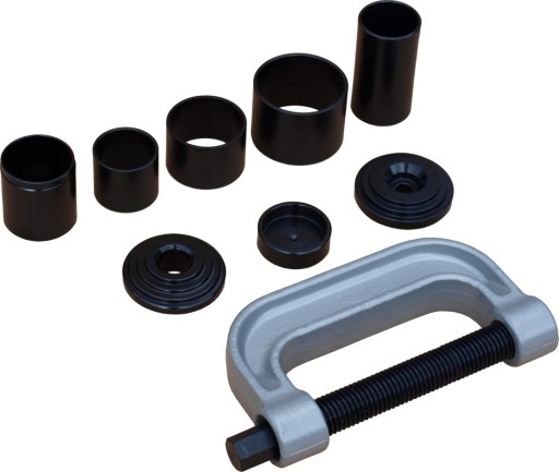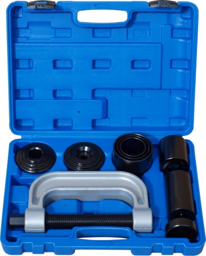 Zestaw służy do montażu i demontażu łożysk w zwrotnicach oraz tulejek zawieszenia. W zestawie prasa śrubowa i adaptery. Wszystko w eleganckiej walizce.