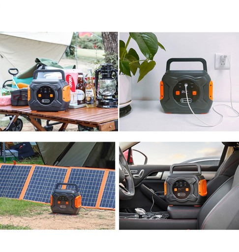 9 WYJŚĆ ZASILANIA ZAPASOWEGO SPEŁNIA TWOJE POTRZEBY: podłączeniey w 2 * gniazdka AC PURE SINE WAVE, może zasilać urządzenie o mocy poniżej 320 W, 1 * porty USB-C 100 W, 2 * porty DC, 2 * porty USB-A, 1 * port QC3.0, 1 * podkładka do ładowania bezprzewodowego. Generator może jednocześnie zasilać 9 urządzeń.
