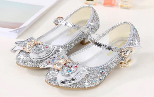 Kryształowe pantofelki pięknie błyszczą i cudnie wyglądają na nóżce. Niewielki obcas to marzenie każdej dzieczynki.