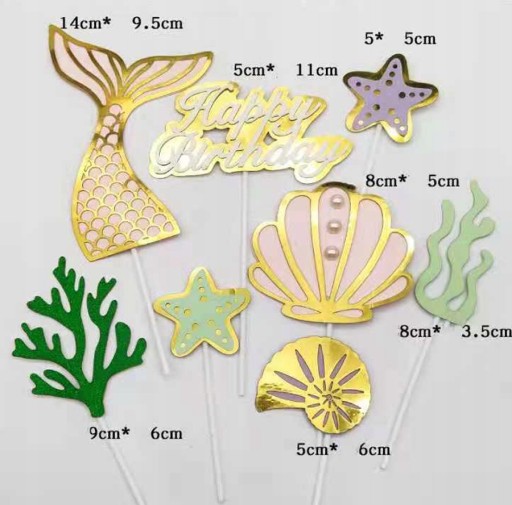Zestaw 8 topperów z kolekcji Syrenka ozdobionych morskimi zwierzątkami i nie tylko. Świetna dekoracja tortu, muffinek ciast...