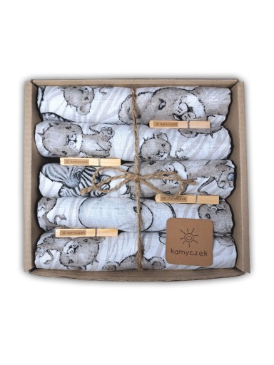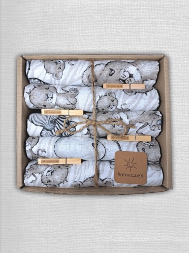 Komplet 5 sztuk najwyższej jakości pieluszek jest efektownie opakowany, gotowy do wręczenia jako prezent. W zestawie znajduje się również gratis w postaci firmowych klamerek.
