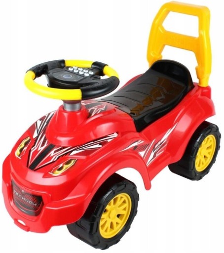 Elektroniczna kierownica przyniesie dziecku radość podczas jazdy. Osiem przycisków, to osiem różnych sygnałów: uruchomienie silnika, hamowanie, pogotowie, pogotowie i straż pożarna, ostrzeżenie „fa-fa” i zabawna muzyka. Chodzik ma oryginalny, przyjazny wygląd, świetnie posłuży jako pierwszy pojazd każdego dziecka.