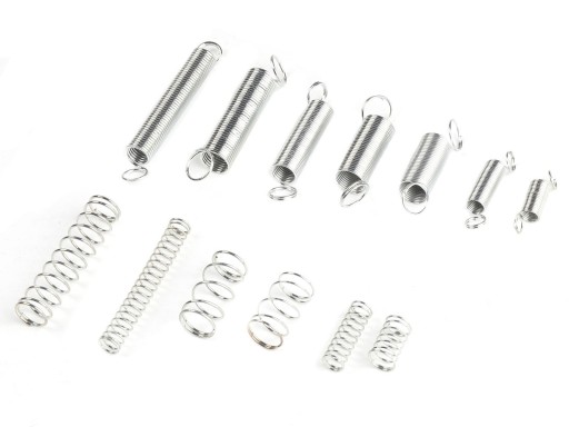 Sprężynki pracują na ściskanie i rozciąganie. Całość umieszczono w wygodnym opakowaniu.