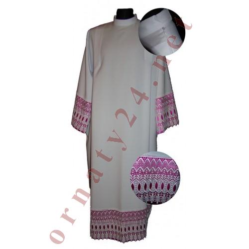 Alba wykonana z białego materiału zdobiona pasami gipiury o szerokości 22 cm z podbitką amarantową. Na innych moich aukcjach alba dostępna również z czerwoną i czarną podbitką oraz w wersji bez podbitki.