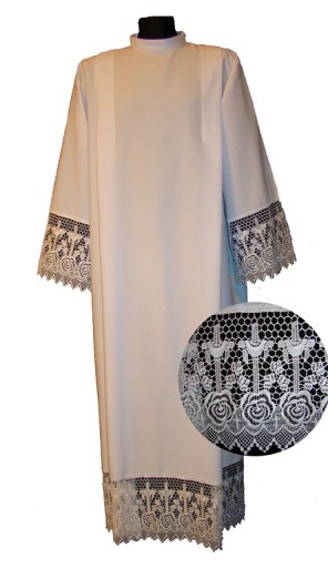 Alba wykonana z białego materiału zdobiona gipiurą o szerokości 20 cm. Alba bez podbitki. Na innej mojej aukcji alba dostępna również z czarną podbitką.