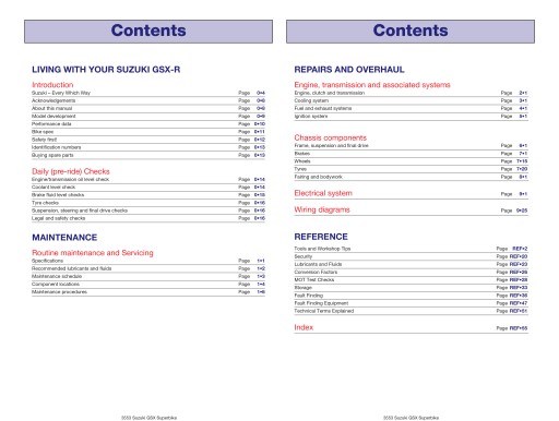 W książce opisano motocykle marki SUZUKI GSX-R600 serii V, W, X, Y (modele 1997-2000) oraz SUZUKI GSX-R750 serii T, V, W, X (modele 1996-1999). Książka zawiera historię modelu, przygotowanie motocykla do jazdy, szczegółowe dane techniczne, informacje o przeglądach okresowych, specyfikacje modelu, praktyczne porady i tricki serwisowe.