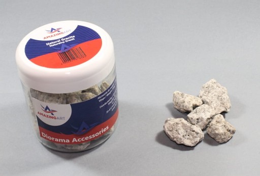 Naturalny granit rozmiar 4W opakowaniu znajdują się różne kształy oraz wymiary kamieniStosowane w budowie makiet, dioram, podstawek do figurek w różnych skalachWaga 250g +/- 5%