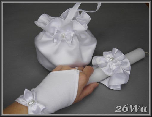Komplet komunijny: Rękawiczki pięciopalczaste oraz torebka komunijna z satyny ślubnej pierwszego gatunku z wkładką pomagającą w zachowaniu kształtu torebki nawet po jej obciążeniu. Torebka ozdobiona została po obu stronach rączki, uroczymi kokardkami z owalną perełką. Na pozostałych aukcjach dostępne są rękawiczki zakładane na jeden paluszek. Cena nie zawiera świecy.