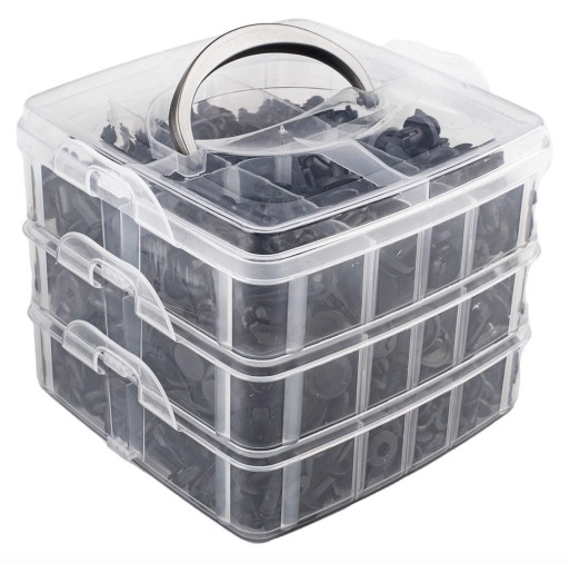 Zestaw 620 ELEMENTÓW, w skład którego wchodzi 16 najpopularniejszych rozmiarów klipsów i łączników mocujących.