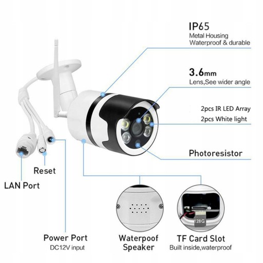 - Zasięg IR do 30 metrów + dwa światła do kolorowych zdjęć w nocy