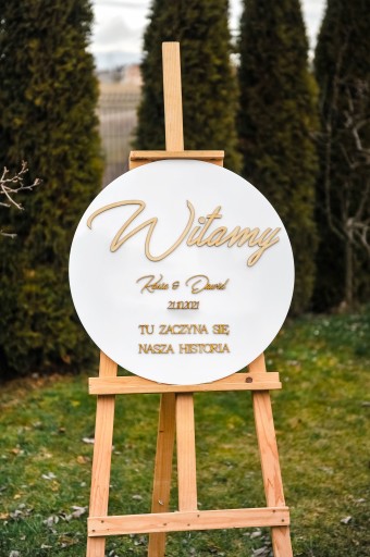 Piękna dekoracja witająca gości przed domem jak również przed salą weselną. Napisy wykonane metodą cięcia laserowego z drewnianej sklejki i przyklejone do płyt białej plexi.