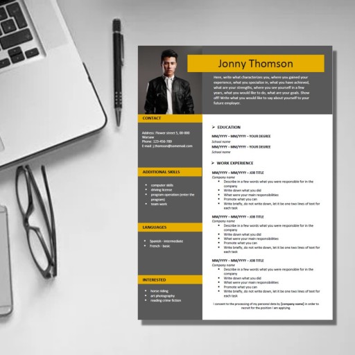 Edytowalny szablon CV w wersji angielskiej, w którym możesz w łatwy sposób zmienić według własnych potrzeb: treść, kolory, zdjęcie, wielkość i rodzaj czcionki.