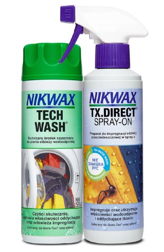 Zestaw dwóch impregnatów Nikwax: Tech Wash i Tx. Direct Spray-On. Obydwa o pojemności 300 ml.