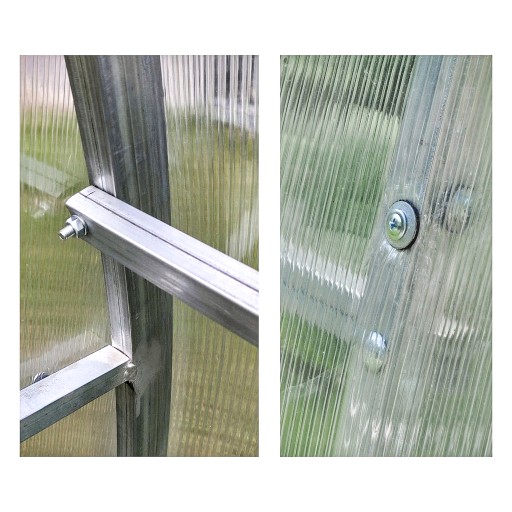 6. Całosezonowa wytrzymałość – od wielkości przekroju profili zależy wytrzymałość szklarni. W konkurencyjnych szklarniach można znaleźć profile wykonane z plastiku PVC połączone za pomocą złączek. Wiadome jest, iż plastik z czasem traci na jakości z powodu warunków atmosferycznych. Słońce również nie sprzyja jego żywotności. Nasze profile są wykonane ze stali ocynkowanej galwanicznie łączone za pomocą śrub i nakrętek ocynkowanych, które są gwarancją długiej żywotności szklarni bezwzględu na pogodę bądź upływ czasu. Dodatkowo półokrągły kształt powoduje, iż śnieg nie zalega na dachu szklarni.